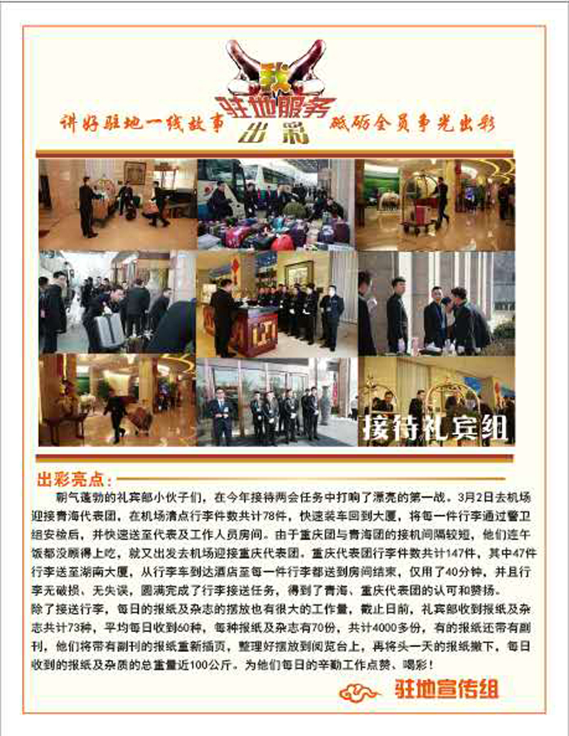 3月4日大厦礼宾部全体成员分两队前往机场接取代表们的行李,回到驻地后礼宾员们一边帮忙将行李过安检一边忙着运送到代表房间。两名礼宾部的同学任劳任怨,以耐心周到的服务赢得了代表们的好评。