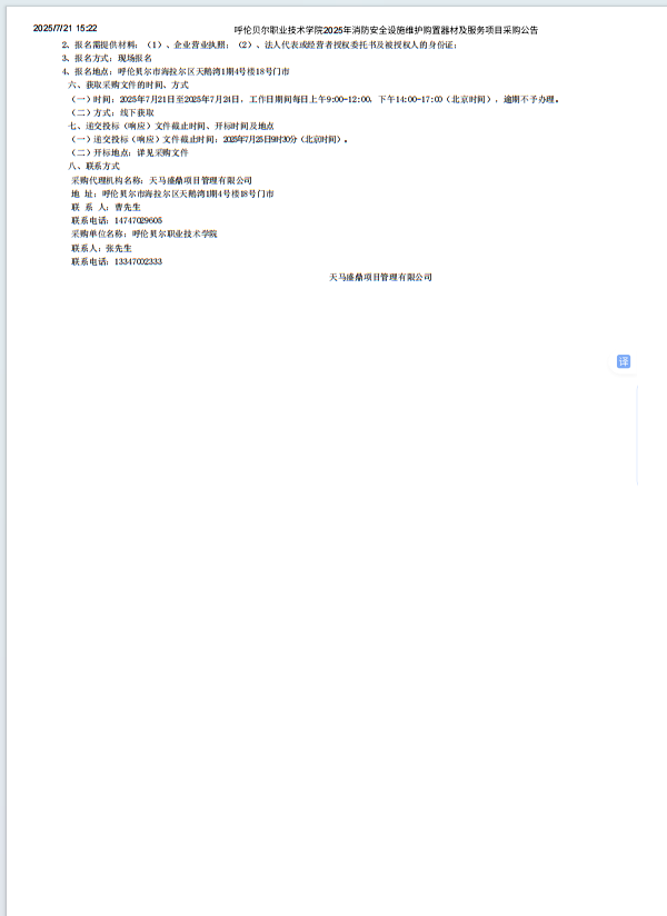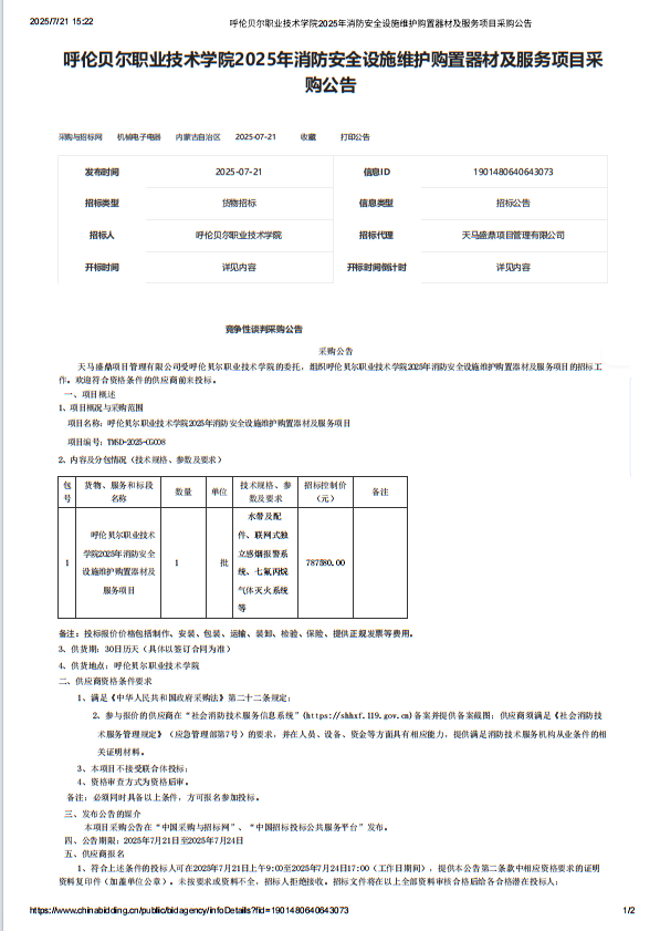 呼伦贝尔职业技术学院2025年消防安全设施维护购置器材及服务项目采购公告